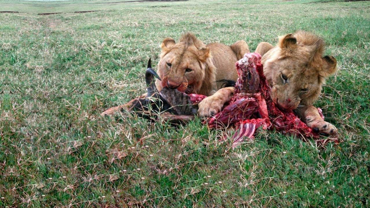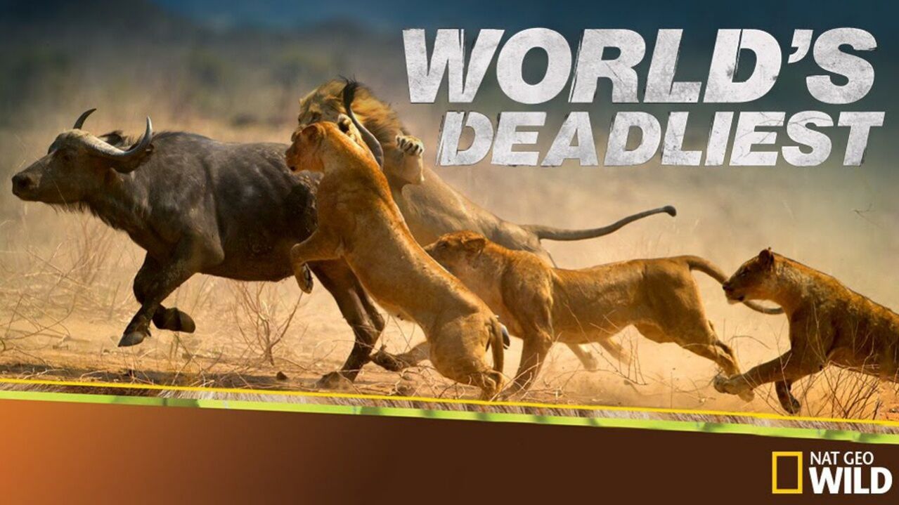 מועדון קרב פראי 4 - 2. המסוכנים של אפריק בעלי חיים. 2. המסוכנים של אפריקה: ערבות אפריקה הן בית לכמה מהטורפים המפחידים ביותר בעולם. שלושה אריות טועים ומנסים לצוד קרנף לוחמני. ש.ח.